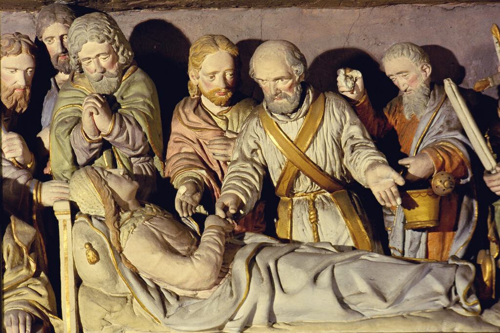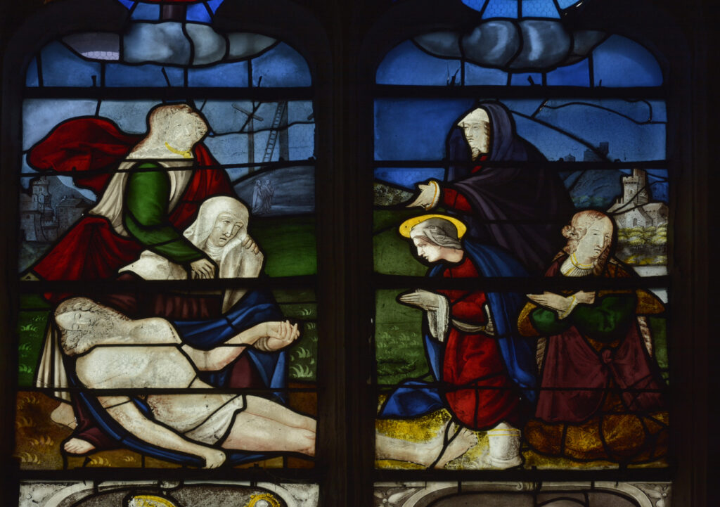 Enfin, à BAILLOU, cette petite église de campagne fut fondée par l’évêque du Mans saint Julien et reconstruite au XVIe siècle. Son architecture n’est pas exceptionnelle, mais elle propose à notre regard des œuvres de grand intérêt : les vitraux de la Renaissance et un curieux retable en haut-relief sur la mort, ou plutôt la Dormition de la Vierge entourée des Apôtres éplorés. Cette œuvre du XVIIe siècle représente de façon réaliste la scène, prélude à l’Assomption de Marie. Elle peut nous émouvoir par les expressions de compassion et de tristesse des visages Apôtres. Elle était primitivement pourvue de volets peints en grisaille qui représentent des figures d’Évangélistes à l’extérieur et des scènes de la vie de la Vierge à l’intérieur mais ils sont actuellement utilisés comme portes d’armoire ! Les vitraux sont surtout consacrés à des figures de saints et l’un d’eux , daté de 1520, reprend le thème de la Dormition de la Vierge.